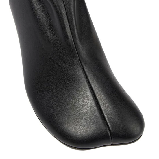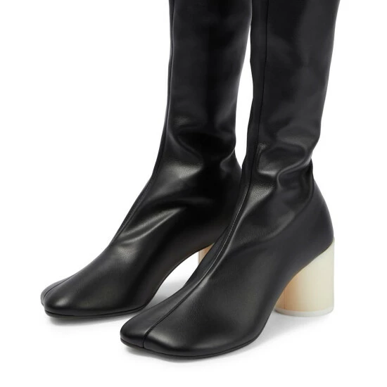 These over-the-knee boots from MM6 Maison Margiela are made from distinct panels of black faux leather that are stitched together at the middle. They feature contrasting cylindrical block heels and characteristic anatomical toes.