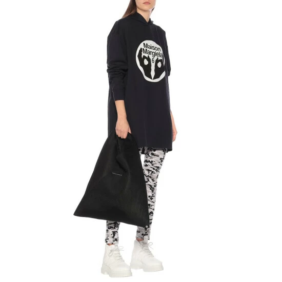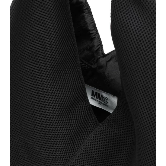 The black Japanese Medium tote from MM6 Maison Margiela is defined by a triangular cut that provides optimal storage space. Crafted in Italy from mesh, it suspends from a rolled leather top handle and is subtly accented with a logo charm in one corner.