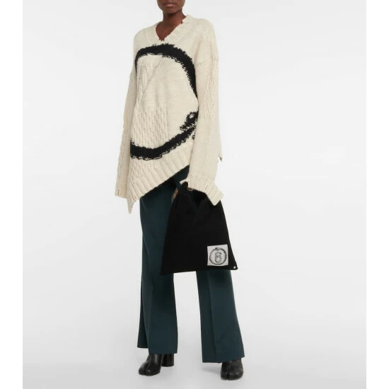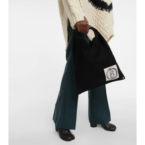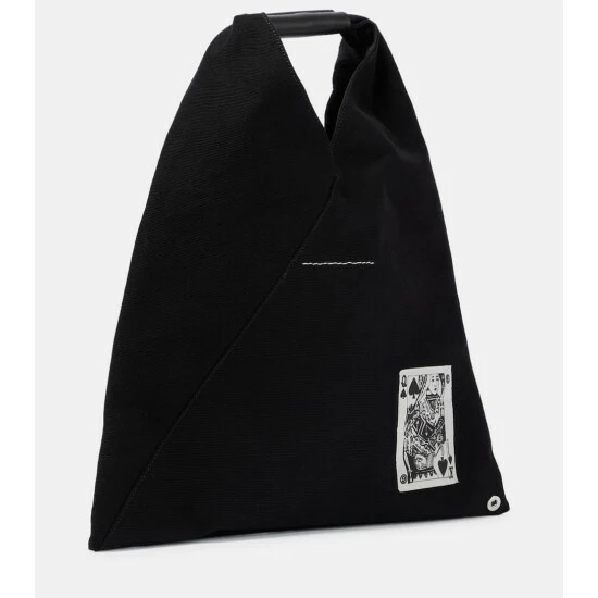 MM6 Maison Margiela reintroduces its signature Japanese tote bag with familiar house codes. In the iconic triangular cut -for optimum storage- the canvas design features the snake MM6 logo and the brand’s Playing Card motif.