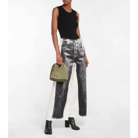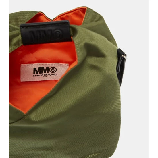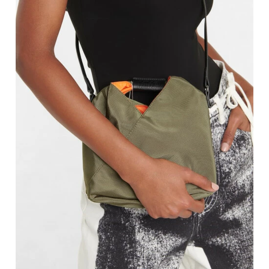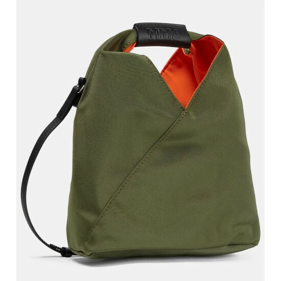 Mm6 Maison Margiela’s signature Japanese Small tote is presented here in durable fabric with leather trims. Its triangular shape is inspired by origami and bends and folds for optimum storage. Note the label’s recognizable stitching at the back.