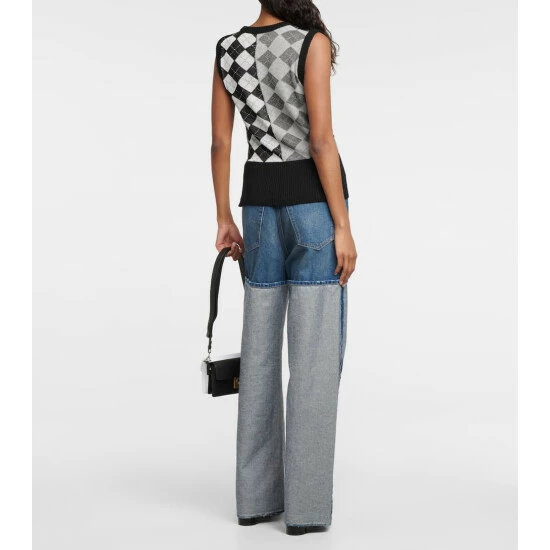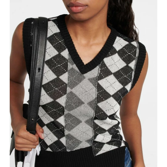 This sleeveless vest showcases MM6 Maison Margiela’s fascination with discordant design. Featuring a double-sided argyle knit broken up by a brand-signature splicing effect, this asymmetrical style features ribbed detailing at the collar, cuffs, and hem.
