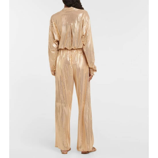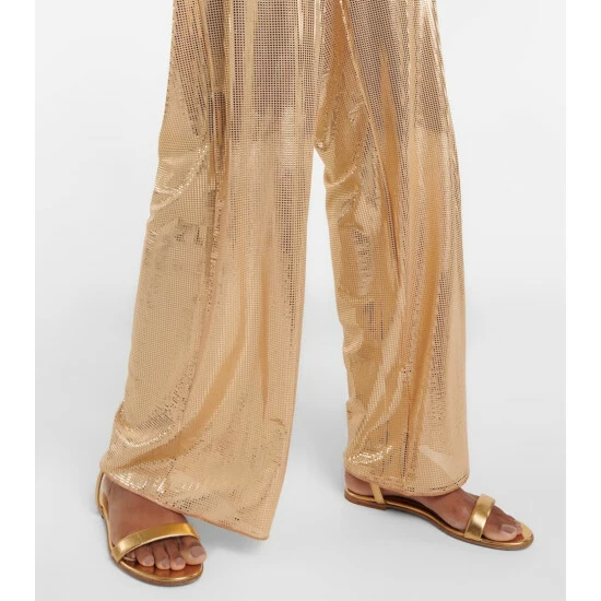 Update your festive edit with the high-octane Disco pants from Oséree. Covered in gleaming gold-tone spots, the wide-leg style has a fluid silhouette and drawcord waist.
