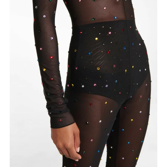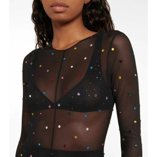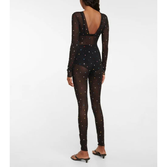 This semi-sheer full bodysuit from Oséree is a must-have for your party edit. The body-hugging style has a low-cut back and is punctuated with multicolored crystal embellishments.