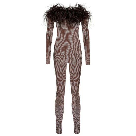This jumpsuit from Oséree is made in Italy from stretchy soft mesh that sits comfortably on the skin and hugs every curve. The brown design is finished with ostrich feathers adorning the off-shoulder neckline.
