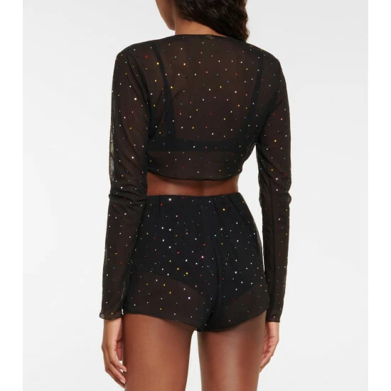 The Gem shrug from Oséree evokes a sense of early ’00s nostalgia. It’s made from semi-sheer mesh and embellished with multicolored crystals.