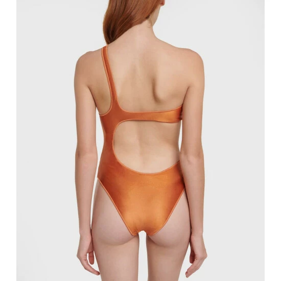The Glow swimsuit from Oséree is made from a head-turning laminated swim fabric. The illuminating orange style has a one-shoulder silhouette with cutouts at the waist and ruching at the bust.