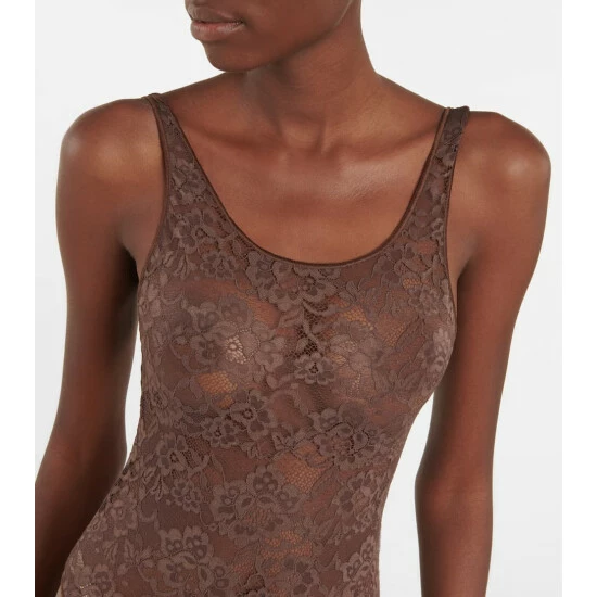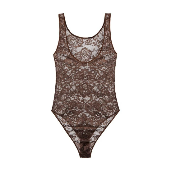 This bodysuit from Oséree is made from sheer floral lace. It has a fitted silhouette and a scoop neck and back.