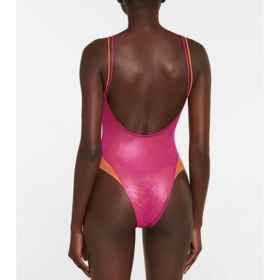 For a burst of color by the pool, turn to this bold Lamé swimsuit from Oséree. Featuring a striking combination of orange and fuchsia, the slick one-piece style has thin double straps and high-cut legs.