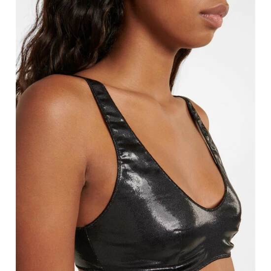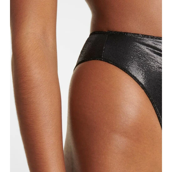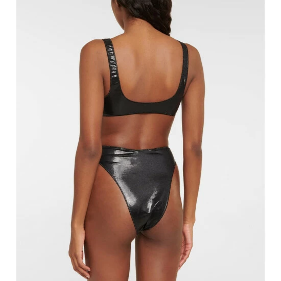 The ’90s bikini from Oséree is shaped to a classically sporty silhouette with high-cut legs for minimal coverage. It’s made from laminated stretch swim fabric with piped trims for ultra-glamour and a head-turning shine.