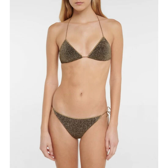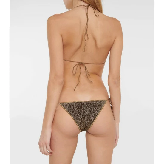 Dazzle in this brown Lumière bikini from poolside-specialist Oséree. It’s cut to a timeless triangular silhouette with slender ties that fasten at the back of the neck and on either side of the waist. Please note that this style provides minimal coverage.