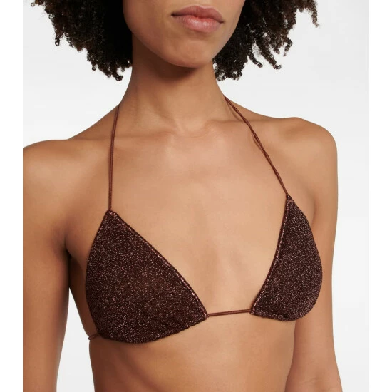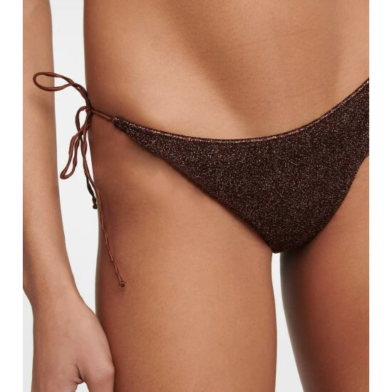 Offering minimal coverage, the Lumière set comprises a classic, halterneck bikini top and low-rise bikini bottoms with self-ties. Oséree’s Lumière fabric is threaded with very fine metallic strands to achieve its unique shimmering finish.