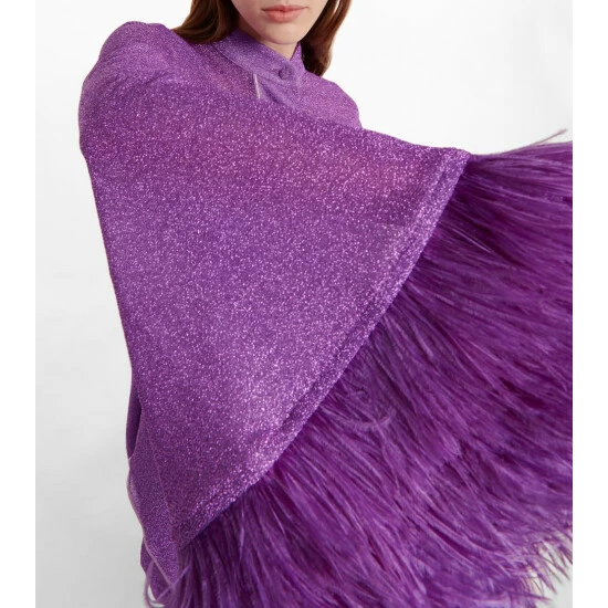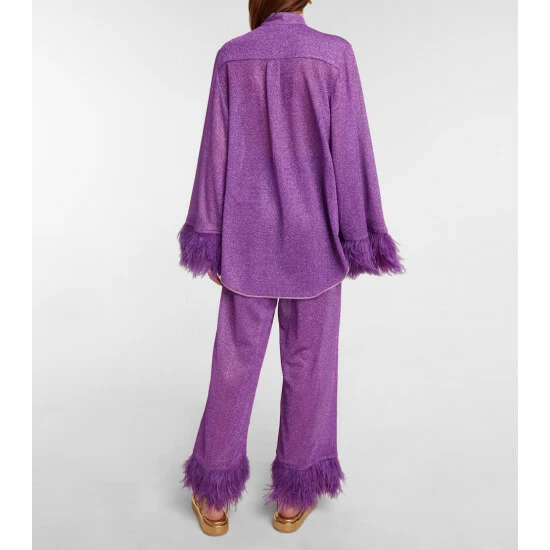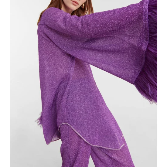 Dare to shine with this Lumière blouse from Oséree. Made in the brand’s signature metallic knit, the glamorous design has feather-trimmed cuffs, gold piping, and a rounded hem.