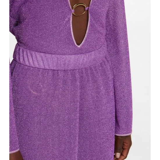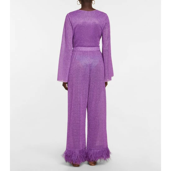 These Lumière feather-trimmed pants from Oséree are party-ready. Cut from the brand’s signature metallic knit, the high-rise style features a wide-leg silhouette.