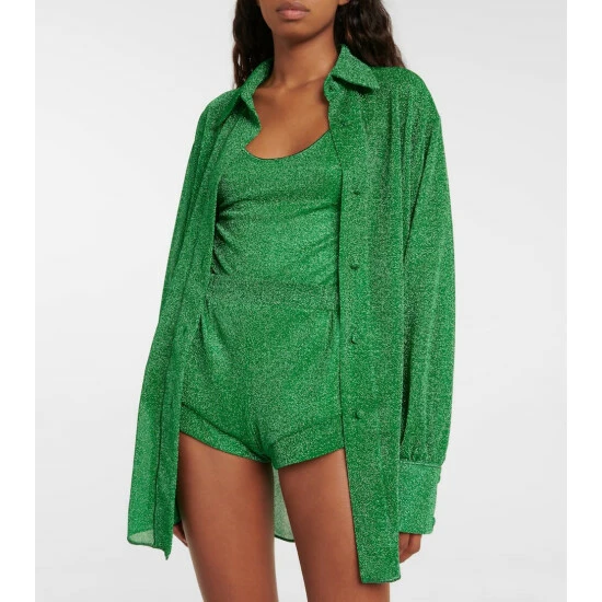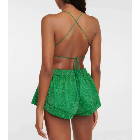 High temperatures call for the comfort of the ultra-high-cut wide legs of the Lumière shorts from Oséree. Made from the label’s signature stretchy metallic fabric, they sit at a flattering high-rise.