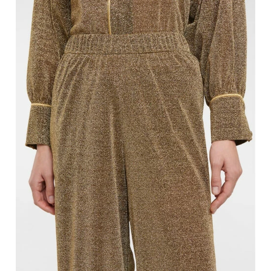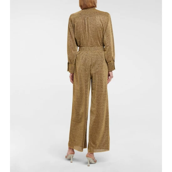 Channel ’70s style with the Lumière pants from Oséree. Made from the label’s signature metallic knit, they have an elasticated waist and wide-cut legs with golden piping. Style with the matching shirt.