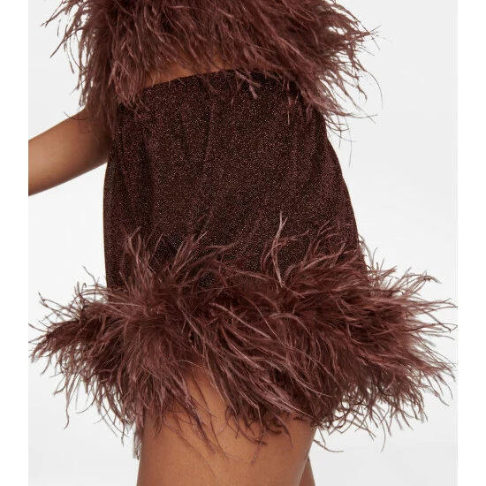 The high-rise Lumière Plumage shorts feature an elasticated waistband and a feather trim for explosive dimension. Oséree’s Lumière fabric is threaded with very fine metallic strands to achieve its unique shimmering finish.