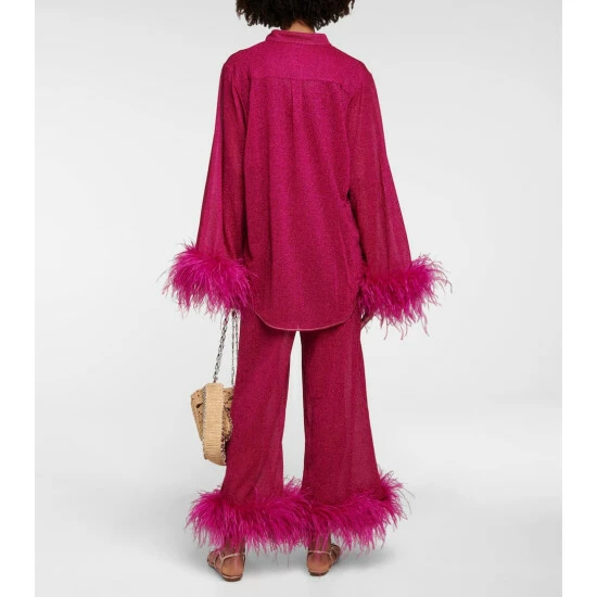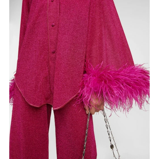 Oséree’s Lumière fabric is threaded with very fine metallic strands to achieve its unique shimmering finish. The Lumière Plumage shirt is shaped for a relaxed, oversized fit with feather-trimmed, wide sleeves and a stand collar.