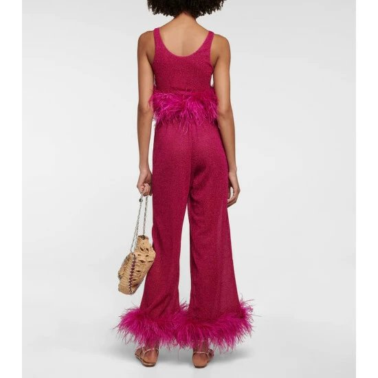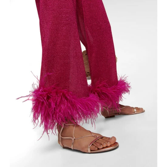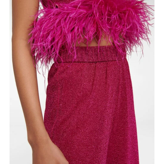 Oséree’s Lumière fabric is threaded with very fine metallic strands to achieve its unique shimmering finish. The Lumière Plumage pants feature wide legs, an elasticated, high-rise waist, and explosive, feather-trimmed cuffs.