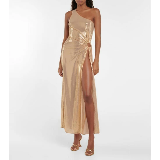 This gown from Oséree is primed for the party season. Made from lamé, it has a one-shoulder neckline, and a O-ring detail at the waist.